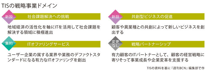 新設した二つの戦略事業ドメインではどのようなビジネスを展開するのか。新しい中期経営計画では、昨年度(24年3月期)までの四つの戦略事業ドメインのうち二つを見直し、社会課題解決への挑戦と共創型ビジネスの促進を新設した。前者は「社会課題」という新しいテーマを設定し、後者は昨年度までのやや漠然とした「新規市場の開拓」を「共創型ビジネス」に絞り、ターゲットをより明確にした。ほかにもBPOなど業務サービスを「ITオファリングサービス」に集約する一方、有力顧客のITパートナーとして経営戦略に寄りそう「戦略パートナーシップ」については引き続き重点領域として継続していく(図参照)。