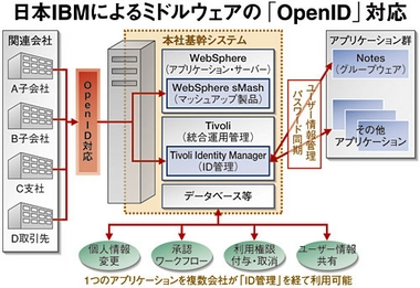 OpenIDファウンデーション・ジャパンに加盟している日本IBMは、システム管理ソフトなどミドルウェアの領域で「OpenID」を利用した関連ビジネスを手がけている。同社ではシステムに分散するID・パスワード情報の統合管理が可能な「Tivoli Identity Manager」やマッシュアップ基盤「WebSphere sMash」を「OpenID」に対応させ、ユーザー企業へ導入を促す戦略を模索している。