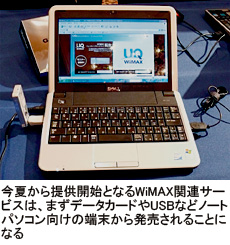 当面は、パソコン(PC)のデータカードを中心に個人ユーザー向けサービスが優先される。法人市場を掘り起こすのは次のステップになりそう。「『MVNO』へ参加を促すには、法人市場に合った体制を整える必要がある」(ウィルコムの上村室長)というのがその理由だ。また、UQコミュニケーションズがKDDI陣営として携帯電話、ウィルコムがPHSを、この先もビジネス展開するには、モバイル関連の製品・サービスを拡充することも求められる。携帯電話、PHSとも、これまではシステム案件で導入されるケースが稀だったからだ。「多くのユーザーにWiMAXによる『真のモバイル・ブロードバンド』を提供する」(UQコミュニケーションズの田中社長)と、単なるモバイル端末販売だけではこの事業が立ち行かなくなると指摘する。