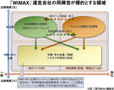 KDDI陣営にはこれまでに、大企業のオフィスシステム案件を獲得した実績がある。ウィルコムは医療など特化市場の大企業に強みをもっていた。「MVNO」を獲得し、これらを経由して中堅・中小企業(SMB)などへシステム提案するためには、個々のユーザーにマッチした「商材」をいかに増やすかが問われる。