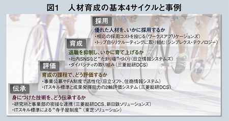 人材育成は、採用→育成→評価→伝承の四つの基本サイクルを継続させることが基本である(図1参照)。それぞれの段階で、各社それぞれ知恵を絞ったり、ユニークな取り組みを行っている。
