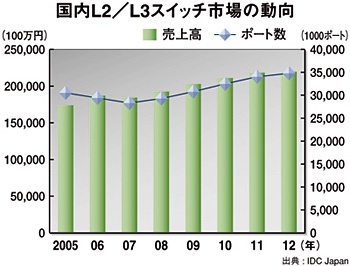 キーワードを軸に事業拡大へ 調査会社のIDC Japanによれば、国内L2/L3スイッチ市場規模は、年平均成長率が2012年まで3.7%と予測されている。この成長は、NGN(次世代ネットワーク網)を中心に通事業者やサービスプロバイダのネットワークインフラ増強が進むためだ。通信事業者をメインターゲットにビジネスを手がけるネットワーク系販社にとって、安定的にビジネスを維持する可能性があることを示している。