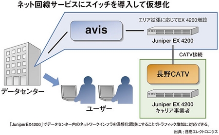 日商エレクトロニクスは、データセンター事業を手がける電算からジュニパーネットワークス製スイッチ「EX4200」シリーズの受注獲得をはじめ、50社程度に導入した実績をもっている。同シリーズの売りである「バーチャル・シャーシ」機能が、ユーザーに受け入れられたようだ。「バーチャル・シャーシ」は、複数のスイッチをつなげることで1台の大型スイッチのように動かすことができる。ユーザー企業にとって、拡張性の高さがメリットになる。電算は、長野県内で提供するケーブルテレビのインターネット接続サービス「avis」のトラフィック増大に備えて柔軟なインフラを構築したのである。