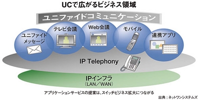 通話やメールなどビジネスコミュニケーションを一つのインタフェースに統合した「ユニファイドコミュニケーション(UC)」。ネットワーク系販社は、アプリケーション側のUCを提案することでL2/L3スイッチの拡販につなげている。世界同時不況で先行き不透明な状況のなか、コスト削減に動く企業が多く、業務効率化やコスト削減を目的として、UC関連の製品・サービスを導入する傾向が出ているという。