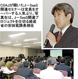 3月9日、あるセミナーが東京・新宿で開催された。会場には定員をオーバーする数の参加者が訪れ、スタッフがせわしなく追加の椅子を運び込んでいる。その内容とは、日本コンピュータソフトウェア協会(CSAJ)が開いたJ-SaaS関連セミナーだ。J-SaaSの概要や参加するISVのサービス・販売戦略などを盛り込んだ内容で、来場者はソフトメーカー(ISV)やSIerなどのIT業界人。参加費用はCSAJ会員であっても有料だが、会場はすし詰め状態だ。ITベンダーのJ-SaaSに対する関心の高さを印象づける光景だった。CSAJ業務課の鈴木啓紹氏も「SaaS、J-SaaSに対する会員企業の注目度はかなり高い」と認める。それもそのはず、J-SaaSは異例ともいえる中央官庁主導のプロジェクトで、IT業界に与えるインパクトが大きいからだ。
