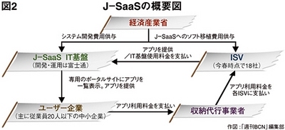 J-SaaSは、簡単にいえば官が用意したSaaS型サービスである。一つの情報システムで複数のISVが持つアプリケーションを稼働させ、全国のユーザー企業にワンストップでネット越しに提供する。SaaS型サービスを提供するためのIT基盤構築・運用費用やソフトの移植費用、普及・啓蒙コストは官が負担。要するに、経済産業省が陣頭指揮を執る官主導で進めた、前例のないサービスとなる。