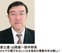強力な販売網を生かす 医師が患者を診察したときに情報を書き込む電子カルテは、医療ITで最初に情報が発生する箇所である。ここが電子化しない限り、検査や薬の処方を伝達するオーダリングシステムや、レセプトシステムを含む医事会計システムへの情報の受け渡しの効率は高まらない。さらに、異なる医療機関と連携した医療ネットワークを構築するには、「カルテの電子化なしには本格的な情報共有は難しい」(富士通の山路雄一・ヘルスケアソリューション事業本部副本部長)という。富士通は電子カルテで病院全体の3割余りのシェアを獲得しており、普及率の向上を推進することでビジネス拡大を虎視眈々と狙う。