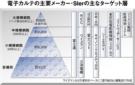 富士通は、医療ITのターゲットの広さと、販売網の強さを併せ持つ。医療ITに参入する多くのベンダーが、病院の規模別に主要ターゲット層を絞るなか、富士通は診療所から大規模病院に至るまでフルラインアップで臨む。さらに、富士通エフ・アイ・ピーや富士通ビジネスシステム(FJB)など直系販社、都築電気やキヤノンITSメディカル(旧FMS)など全国系有力ビジネスパートナーが富士通の医療IT製品を担ぐ。地域では、鹿児島の日本システム、大阪の医療情報システム、中部のトーテックアメニティ、秋田のシグマソリューションズなどが活躍。あまりに強固な販売網を築いているので、新規参入のSIerのなかには「富士通チャネルには入りにくい雰囲気がある」(大手SIer幹部)と、愚痴をこぼすところもあるほどだ。 次ページからは、メーカーやSIerそれぞれの戦略を追う。