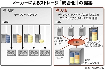 ストレージ統合とは? デジタルデータが主流になりつつあり、社内のデータ量が急速に増大している。ユーザー企業の多くはストレージ容量の効率的な管理やバックアップの見直しなどといった課題に頭を悩ませている。導入コストや管理の簡便性などから、サーバーにストレージを直接接続する「DAS(ダイレクト・アタッチド・ストレージ)」という方式を採用しているケースが多いためだ。