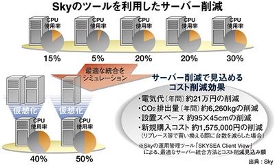 例えば、サーバー台数の削減だ。この新版ソフトを導入すれば、企業内に点在するサーバー台数の稼働率のほか、CPUの使用率や消費電力、ハードディスクドライブ(HDD)の空き容量が自動計測できる。ここで導き出したデータをもとに、フル稼働していないサーバーに負荷分散することで新規サーバーの購入を見送ることもでき、サーバー統合による運用費削減を図ることもできる。