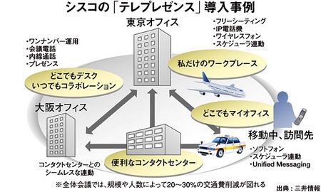 拠点間の業務連絡を電話ですませることが多いが、「コミュニケーションを密にとる」という用途で「テレプレゼンス」を導入した場合も、通常の固定電話に比べて通信費など最低10%程度の削減が可能という。「テレプレゼンス」はIPベースの電話で、呼処理システムと連動して受けるために電話料金が安価に収まるのがその理由だ。