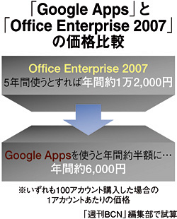 単純な比較は難しいが、マイクロソフトの「Office Enterprise 2007」と比較してみよう。ソフトバンクBBの子会社であるライセンスオンライン社のオンライン見積もりサービスを使って100アカウントを計算すると、約600万円と弾き出される。WordやExcel、PowerPoint、Outlookなどを含めたもので、仮に5年間使えば1アカウントあたり年間約1万2000円。「Google Apps」に比べ約2倍の価格水準だ。