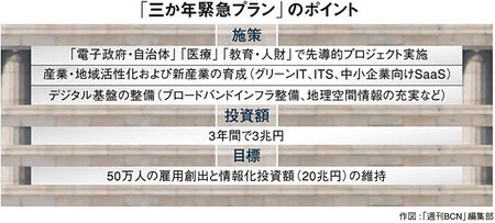 政府の「高度情報通信ネットワーク社会推進戦略本部(IT戦略本部)」は4月9日、IT基盤整備とIT産業活性化を目的とした「デジタル新時代に向けた新たな戦略~三か年緊急プラン~」を決定した。この計画で政府は3年間で約3兆円を投じ、50万人の雇用創出とIT 産業規模の維持を目指すつもりだ。3兆円、この慈雨はどこに降り注ぐのか――。