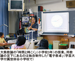 「時間と時こく」 先進的にデジタル教育を推進する学芸大学付属世田谷小学校(東京・世田谷区)の大熊雅士教諭が実践した3年生の授業を参観した。同教諭は、都内複数の教育委員会で、1台50万円ほどするパソコンなどコンピュータ利用が始まった当時から指導主事として活躍。対話型電子表示装置(電子白板)や無線LANの学習活用では、先駆的な取り組みをしてきた。