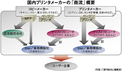 大塚商会で商品物流を担当する本多豊・執行役員は「社内のプリンタを集約する傾向にあり、リプレースに際して省スペースでランニングコストが低いA4機が求められている」と、傾向を語る。ダイワボウ情報システムの猪狩部長も、「A4カラーのシングル機と複合機がよりコンパクトになれば、需要拡大の可能性がある」と、今後の盛り上がりを否定しない。一方、リコーとコニカミノルタ製品を中心に仕入・卸を行う丸紅インフォテックは、「供給過剰傾向が強く、買い増し導入は望めない」(鳥羽裕之・MD1部ハードウェア2課長)と、売り方に工夫をこらす必要性を説く。