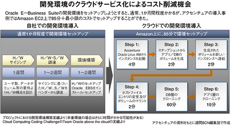 アクセンチュアの導入事例によれば、パブリッククラウドの代表格の一つAmazon EC2にERP(統合基幹業務システム)のOracle EBSを約85分間でセットアップできることを実証した。通常はハードリソースの設計や購入、構築などで約1か月かかるという。リソースの調達費や人件費を考えるとコスト差は大きい。同社では、パブリッククラウドとユーザーの要求レベルとの差を埋めるべく、セキュリティや可用性、信頼性、バックアップなどの独自の付加サービスを充実させることで収益力を高める。