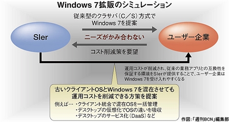 「Vista」で商機を期待し、早い段階で落胆の憂き目をみてきたSIerの「Windows 7」への反応は二分される。SIerの目下の関心事は、年度末商戦に向けた受注拡大と来年度の予算獲得。ITインフラ案件の受注増でポイントになるのは、コスト削減にどれだけ貢献するかだ。あるSIer幹部は「『Windows 7』でどれだけコスト削減できるのかを明確にする必要がある」と指摘する。クライアントOSの「新バージョンが出た」という大義名分だけで、コスト削減効果がどれほど得られるか明確でなければ、厳しい状況に陥る可能性があるからだ。