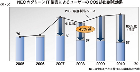 NECがユーザーに対してアピールするのは、グリーンITによる効果の“見える化”だ。省電力製品を自社で認定する独自制度「エコシンボルスター」を創設。05年度の製品と比較して54%の省電力や50%の省スペース化などを実現した「Express5800」などへのロゴ付けで訴求している。また、従来のモデルと比較したデータモデルを提示し、営業担当者が売り込みのツールとして利用する取り組みも始めている。