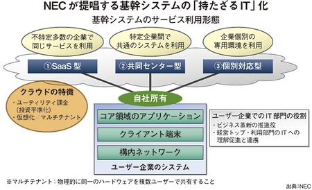 サービスを開始するにあたり、実際にNEC社内でシステムの全面刷新を今年3月から実施。ワールドワイドで構築を進めており、日本の主要なデータセンターにシステムを集約しているという。こうしたノウハウを生かしてサービスインしたわけだ。広崎膨太郎・副社長は、「当社の場合、社内システムのTCOを2割程度は削減できる。このサービスを導入すれば、システムの効率化を図ることができるのは間違いない」と自信をみせている。また、同サービスの特徴として「企業のシステムは、使用価値と所有価値を分けて考えなければならない。そのため、当社はクラウド・サービス事業を手がけるうえで、まずはシステムの全体最適化を促している」としている。