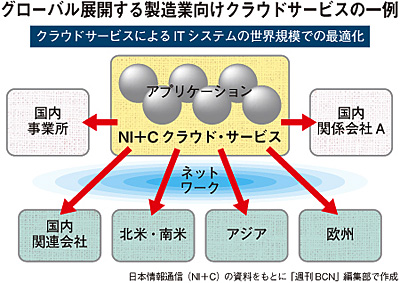 ITサービスの海外流失 パイオニアからクラウド方式による情報システム基盤を受注した日本情報通信(NI+C)は、2010年度以降、順次、パイオニアの海外拠点向けのサービスをスタートさせる。現行では、国内にある主要システムをクラウドに集約した段階だが、今後は海外拠点のシステムも同クラウドに集中化。運用コストの削減ニーズに応えていく方針だ。