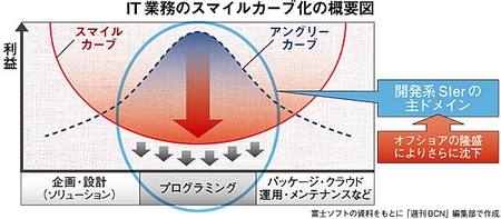 この間、社内報を通じて全社員にビジネスモデル転換の必要性を切々と説いた。下図の“アングリーカーブ”と“スマイルカーブ”の例がそれで、かつてはプログラミング(製造工程)に価値があったが、今は上流の企画・設計と、下流のクラウド基盤や運用・保守により高い価値が見出されるものだ。長らくプログラミングを事業ドメインとしてきた富士ソフトにとって、元請け受注による企画・設計力の強化や、クラウドビジネスへの移行は、高付加価値ビジネスへの移行そのもの。