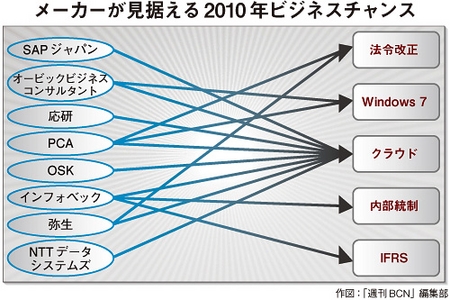 応研は「特殊会計」の公益法人や福祉法人向けで、2010年初頭にクラウド・サービスを開始することを明らかにした。オービックビジネスコンサルタント(OBC)は、2010年を「クラウド元年」と位置づけ、09年に発表した「奉行iシリーズ」などでクラウド・ビジネスを拡大する計画。そのほか、クラウド・サービスの国内投入開始を公表時期より遅らせたSAPジャパンは、中堅・中小企業向け「SAP Business All−in−One」のクラウドサービスを、電通国際情報サービス(ISID)経由で2010年初頭に販売開始する。