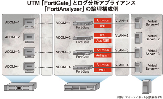 ネットワールドは、「いまバーチャル・アプライアンスのようにハイパーバイザー上に仮想マシンの一つとして導入するタイプと、物理環境から仮想環境に対応したセキュリティ機器を設置して守るという二つのアプローチがある」(マーケティング1部の芹澤朋斉部長)という。後者については、昨年の夏からその代表格であるフォーティネットのUTM製品を推奨している。「今、非常に伸びている商材」(芹澤部長)だそうだ。例えば、1台の物理サーバー上でポリシーがそれぞれ異なる複数の仮想サーバーが動いていると、その分だけそれぞれのセキュリティポリシーにあわせたファイアウォールを設置する必要がある。スペースもコストも負担が大きくなるし、運用管理も複雑になるので、ファイアウォール自体を統合して1台にし、それぞれポリシーに基づいて、すべての仮想サーバーを守る仕組みを提供している。