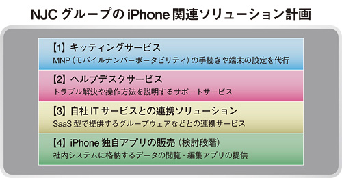 もう一つが「ヘルプデスクサービス」だ。「iPhone」には国内メーカーの携帯電話のように詳細な取扱説明書がない。ゆえにNJCで運用を開始した直後から、ユーザー設定や利用方法について、社内からの問い合わせが殺到した。結果的には「3日ほどかけて約140ページのマニュアルを作成して配布した」(伊庭部長)と振り返る。伊庭部長は、こうしたノウハウもビジネスに応用できると考え、サービスのメニュー化を検討している。3月にはこうしたサービスを体系化して販売する計画という。