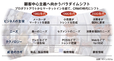 パラダイムシフトが起きる 「新薬メーカーは、MRの情報武装に早くから取り組んできた」。医薬品業界向けCRMに強いイーシステムの市村英彦・常務取締役CRM事業部事業部長は、こう指摘する。ただ、マーケティングにうまく生かすことができていなかった、とつけ加える。市村部長は、CRMの辿った歴史を80年代と90年代、00年代の三つに分けて、次のように説明する。まず80年代は、製品が圧倒的な優位性をもっていた時代で、90年代に下っていくにしたがって、本業以外のメーカーが参入。既存メーカーの優位性が崩れてきた。この頃、小売・POS情報でトレンドを分析し、セグメントニーズを把握しようとする動きが現れた。00年代には、ユーザー個々の細分化されたニーズに対応していく新たな潮流が生まれた。