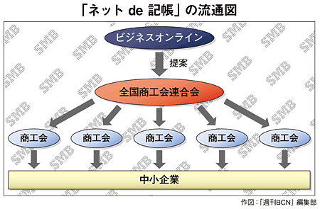 営業担当者がいない創業期、藤井代表取締役は効率的な間接販売方法を模索したなかで、ITベンダーではなく商工会に着目する。会員企業の決算書や各申告書作成業務を代行していた商工会に対し、ASP型サービスを提案。専用システムに比べてコスト負担が少ない点をアピールした。その提案が、商工会を束ねる団体「全国商工会連合会」の耳に入り、標準サービスとして採用が決定。商工会には一定割合の販売報酬を支払う仕組みを用意して、会員の中小企業に「ネット de 記帳」を提案するメリットを与えた。これで、商工会とビジネスオンラインの間にWin-Winの関係が完成した。自社の営業担当者が売り歩かなくても、全国に散らばる商工会に加入している中小企業に一気に普及したわけだ。