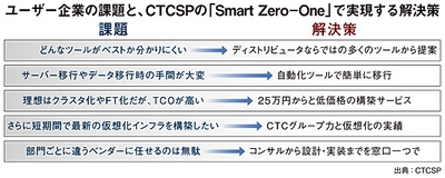 「Smart Zero-One」は、ITサービスの導入や再構築でユーザー企業が求めるソリューションの選定から移行、投資コスト、納期、ベンダー対応などのリスクをゼロにすることを狙ったサービスだ。同社の販社に対する支援を目的にサービス化したもので、ユーザー企業から挙がってくるニーズをマニュアル化しているのが特徴だ。これによって、構築費用の定量化や構築時間の短縮が実現するようになる。