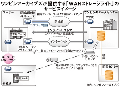 ワンビシアーカイブズでは、オンラインデータバックアップサービスとして「WANストレージライト」を提供。初期費用は無料で、50GBまでのデータ容量を月額料金3万8000円という安価な設定でSMBを開拓しようとしている。同サービスは、遠隔地にある同社のDCでデータをバックアップするというもので、伝送に必要な通信回線や専用ストレージをパッケージ化した。