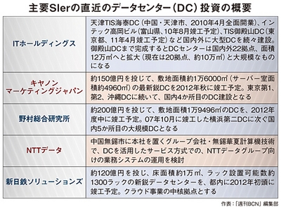 キヤノンMJは、およそ150億円を投じて同社最大規模となる国内4か所目となるDCを2012年秋をめどに竣工する予定で、大規模なDC投資を継続して行っている野村総合研究所も2012年度中に国内5か所目の大規模DCを約200億円を投じて竣工する。