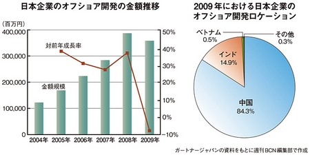質的変化に直面 日々、華々しい経済発展が伝えられる中国──。日本の情報サービス産業にとって、隣国の巨大市場は大いに魅力的である。だが、すべてがバラ色に染まっているわけではない。ガートナージャパンの調査によれば、日本からのオフショア開発は2009年、金額ベースで前年比7.6%も減少した。04年以降、毎年30%前後の勢いで拡大し、うち中国でのオフショア開発が全体の8割余りを占める。ところが、昨年は日本のSIerなどが外注費を大幅に削減。中国での、いわゆる「対日オフショア開発ビジネス」が大打撃を食らった。