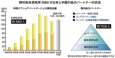 「中国でのソフト開発は減らさない」と、明言してきた野村総合研究所(NRI)でさえ、10年3月期の中国オフショア開発規模は、2年連続で減少。08年3月期は160億円を超えていた発注金額が、10年3月期には130億円前後まで落ちた。中国を中心とするアジアに“第二のNRIをつくる”ことを戦略目標としている同社にとって、中国でのビジネス縮小は大きな課題だ。あるNRI関係者は、「国内パートナーへの発注量は、実はさらに大きい比率で下がっている。これでも中国パートナーには重点的に発注してきた」と明かす。