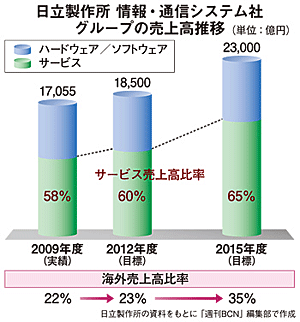 大規模な再編を断行したうえで日立が打ち出した目標は、サービス事業の拡大とグローバル化だ。日本国内の情報サービス市場の飽和感が強まるなか、サービス事業を軸とした海外進出を強化することで、2015年度(16年3月期)に情報・通信システム事業の連結売上高を2兆3000億円へ拡大させるという。このうちサービス売上の構成比は65%、海外売上構成比を35%に高める方針だ。