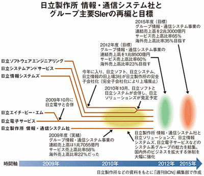 日立製作所グループは、クラウド関連の売上高を、2015年度までに5000億円に拡大させる目標を立てている。09年度が同約500億円だから、ざっと10倍の高い目標であるとともに、海外でのサービスビジネスの拡大にも密接に関連する。グループ各社とサービス関連事業を一体的に運営することで、「海外ビジネスを拡大させる」(日立製作所の中島純三・情報・通信システム社社長)と、グループ一丸となってグローバル化を推進する考えだ。リーマン・ショック以降、厳しい状況にあるなかでも、情報・通信システム事業は、黒字を堅持。その底力を発揮してきた。それだけに、今回の組織大再編は、日立グループ全体の命運をも握っている。
