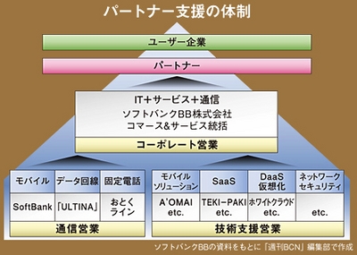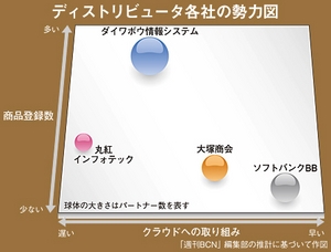 単純に機能面の強化や登録商品・メーカー数などで他社と差異化を図るのは難しくなっている。そこで、従来の“箱売り”にとどまらない事業展開を強化。前述のように、大塚商会はSI力を生かしたクラウドサービスを販売店に提供している。販売店は自社サービスとして収益性の高いストックビジネスの展開が可能だ。一方で、ソフトバンクBBは、IT流通と通信、サービスを併せた“ハイブリッド”なソリューションで優位性を打ち出してきた。とはいえ、販売店の間では“ハイブリッド”モデルの採用が思うように進んでいないという。販売店での営業成績の評価が従来型のままなので、月額課金のシステムが受け入れられにくいのだ。