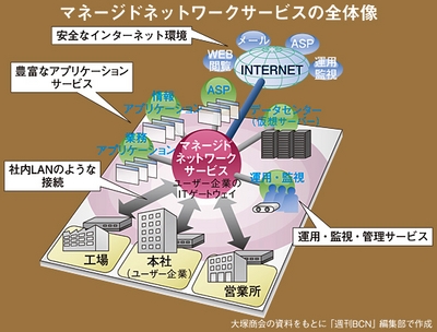 今年に入って提供を開始したクラウドサービスが、「たよれーるマネージドネットワークサービス」である。KDDIのネットワークサービス「Wide Area Virtual Switch(WVS)」をネットワーク・プラットフォームとし、自社データセンター(DC)とユーザーのITシステムを閉域網で接続。業務系アプリケーションサービスやASPサービス、BPO(ビジネスプロセス・アウトソーシング)などを手がけている。