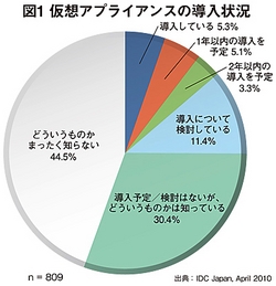 「仮想アプライアンス」という言葉が登場してまだ間もなく、市場が広がり始めたのは1~2年前からという。現状、日本のユーザーはどの程度利用しているのか。IDC Japanの調査によると、「(仮想アプライアンスが)どういうものかまったく知らない」が44.5%と半数近くを占める(図1参照)。一方で、どういうものかを知っている企業もおよそ半分に達していることからすれば、認知度は確実に上がっているといえるだろう。しかし、現段階では限られた市場規模といわざるを得ない。そのなかで、すでに仮想アプライアンスそのものを導入している企業は、5.3%程度。およそ4分の1程度の企業が「導入した」、もしくは「1~2年程度をめどに導入を予定、検討している」と答えている。