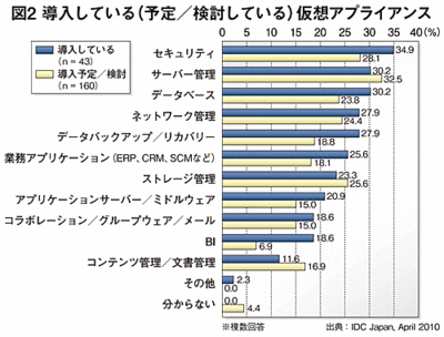 導入している/これから導入しようとしている分野として最も多いのが、セキュリティである(図2参照)。続いて、サーバー管理、データベース(DB)、ネットワーク管理となっているが、業務アプリケーションなども仮想アプライアンスとして利用されているようで、OS上に載るソフトウェアは幅広い。IDC Japanの入谷光浩・ソフトウェアマーケットアナリストは、「サーバーやストレージ管理、ネットワーク管理などのインフラ部分で最初に導入が進み、その後にDB、ミドルウェア部分に広がっていくとみている。セキュリティ、ネットワークといったITインフラを仮想アプライアンスなどによって簡素化し、運用管理を楽にして、コストを低減、その分をBIといった情報活用系のツールに投資することで、新しい売り上げの源泉をつくるような動きも今後みられるのではないか」と予測する。