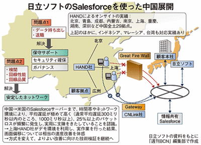 インターネットを使ってソフトウェアを配信するクラウド/SaaS型ビジネスの領域でも、中国向けビジネスが立ち上がり始めている。日立ソフトウェアエンジニアリングは、この6月、クラウド型CRMのSalesforceの中国向け販売で、地元企業2社と協業したと発表。これは、香港に本社を置く通信ネットワーク会社の互聯通網路(CNLink Networks)の高速回線を使って、SIerの上海漢得信息技術(HAND)の運用サポートを活用するというものだ。