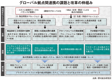 製造業にみられるこうした姿勢は、生産拠点の個別最適化を引き起こした。野村総合研究所(NRI)の辻直志・サービス・産業システム事業本部主席コンサルタントは、「今までは海外工場のシステムは、とにかく動けばよいという意識で、それぞれ別個のシステムを導入してきた」と説明する。サプライチェーンが内包する問題に頭を抱えるメーカーの現状を明らかにするにあたって、よく引き合いに出される例だ。グローバル拠点間のマスター統合で、いかにPSI(生産・販売・在庫)情報の可視化ができるかが課題解決のポイントとなる。