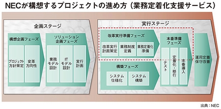 NECは、これまでのサプライチェーン導入事例をもとに、サプライチェーン成熟度を規定し、新規導入のモノサシとして活用している。これが「SCM成熟度診断サービス」で、導入にあたって「業務定着化支援サービス」を提供。プロジェクト全体の企画ステージで確定した改革内容を実行に移すため、同社のノウハウが詰まったテンプレートや方法論を用意する。