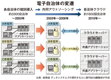 「電子自治体」の実現には、新たなシステムへの投資が必要とされている。これまで自治体では情報システムを庁内で保有し、運用してきたケースが多かった。自治体関連ビジネスに強みをもち、現在行われている自治体クラウド開発実証事業のPMOを務めるデュオシステムズの伊藤元規常務は、「自治体は財政が逼迫しているにもかかわらず、高いシステムの運用・維持コストをかけていたり、ITの専門知識をもった人材を確保するのが難しいなどの課題を抱えている」と状況を語る。そうした課題を解決する施策として、2002年頃にはシステムの開発、運用などを民間企業に外部委託し、各自治体の業務を標準化したうえで、データセンターにあるシステムを共同利用することでコストを削減しながら、電子自治体を実現しようという「共同アウトソーシング」という手法が立ち上がった。共同化によって、ITシステムの運用などにかかる費用を「割り勘」効果で削減する。クラウド・コンピューティングに通じるこの考え方は、「民間よりも自治体の取り組みのほうが早かった」(伊藤常務)という。