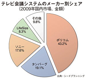 メーカー別の金額シェアをみると、2009年はポリコムが43.2%を獲得しており、他社と圧倒的な差をつけてトップのポジションを維持している。2位は、19.1%のタンバーグ。国産メーカーのソニーは17.6%で3位に甘んじている。 シード・プランニングでは、遠隔会議システムの市場予測を2003年から実施している。今回の予測は、日本国内で関連システムを販売するベンダー81社を調査し、世界市場と日本市場の現状と将来展望についてまとめたものである。