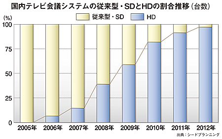 ポイントとなるのは、専用端末のハイビジョン(HD)化だ。2009年にはすでに60%に達しており、2012年には96%と、ほぼすべての端末がHD化する。これは、会議での利用だけでなく、高画質の映像を生かした業務での利用がますます増えるということだ。例として、製造業の開発拠点での利用や遠隔医療などが挙げられる。テレビ会議システムがもたらすビジネスチャンスが大きく広がることを物語っているのだ。