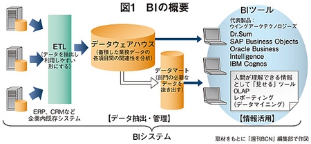 部門最適から全社統合基盤へ ビジネス・インテリジェンス(BI)は、業務システムに蓄積されるデータを、企業の意思決定に役立てるもの。BIの実現には、ETL(Extact/Transform/Load)、DWH(データウェアハウス)など、バックヤードのシステムも含めて、情報を抽出・加工・蓄積・分析・視覚化する一連の仕組みが必要となる。BI製品は、DWHからデータを引っ張ってきてOLAP(Online Analytical Processing)などの分析機能や、情報をグラフィカルに見せるダッシュボードやレポーティングなど視覚化するツールを指す。こうした一連のシステムのなかで最も重要なのはバックヤードの部分で、構築費全体のうち、7~8割が費やされている。