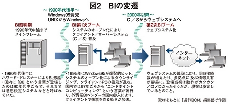 日本でBIという言葉が登場して10年以上が経つ。1990年代に大手外資系企業が日本市場に参入。ITシステムがメインフレームから、オープン化によるダウンサイジングが行われた時期であり、またWindows95が爆発的にヒットし、PCが1人1台の割で普及した。これによって、クライアント/サーバーシステムが盛期を迎えた。システム利用者が主体的にコンピュータを操作して経営や業務に役立てる「エンドユーザー・コンピューティング」という言葉が流行り、そのなかでBI製品は「デスクトップOLAP」製品として販売された。