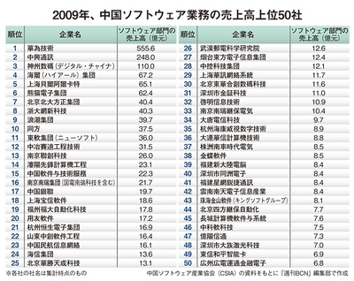 中国上位SIerをみると、ユーザー系SIerが多いことに気づく。中国ソフトウェア産業協会(CSIA)がまとめた2009年の中国ソフトウェア業務の売上高上位50社(図参照)によると、ソフトウェア開発のビジネス規模で1、2位を占めるのが通信機器の有力ベンダーである華為技術(ファーウェイ)と中興通訊。3位が日本の有力SIerのSJIと資本業務提携を行い、ITホールディングスなど日系トップSIerとも関係が深い神州数碼(デジタル・チャイナ)、続いて家電で有名な海爾(ハイアール)集団が名を連ねる。